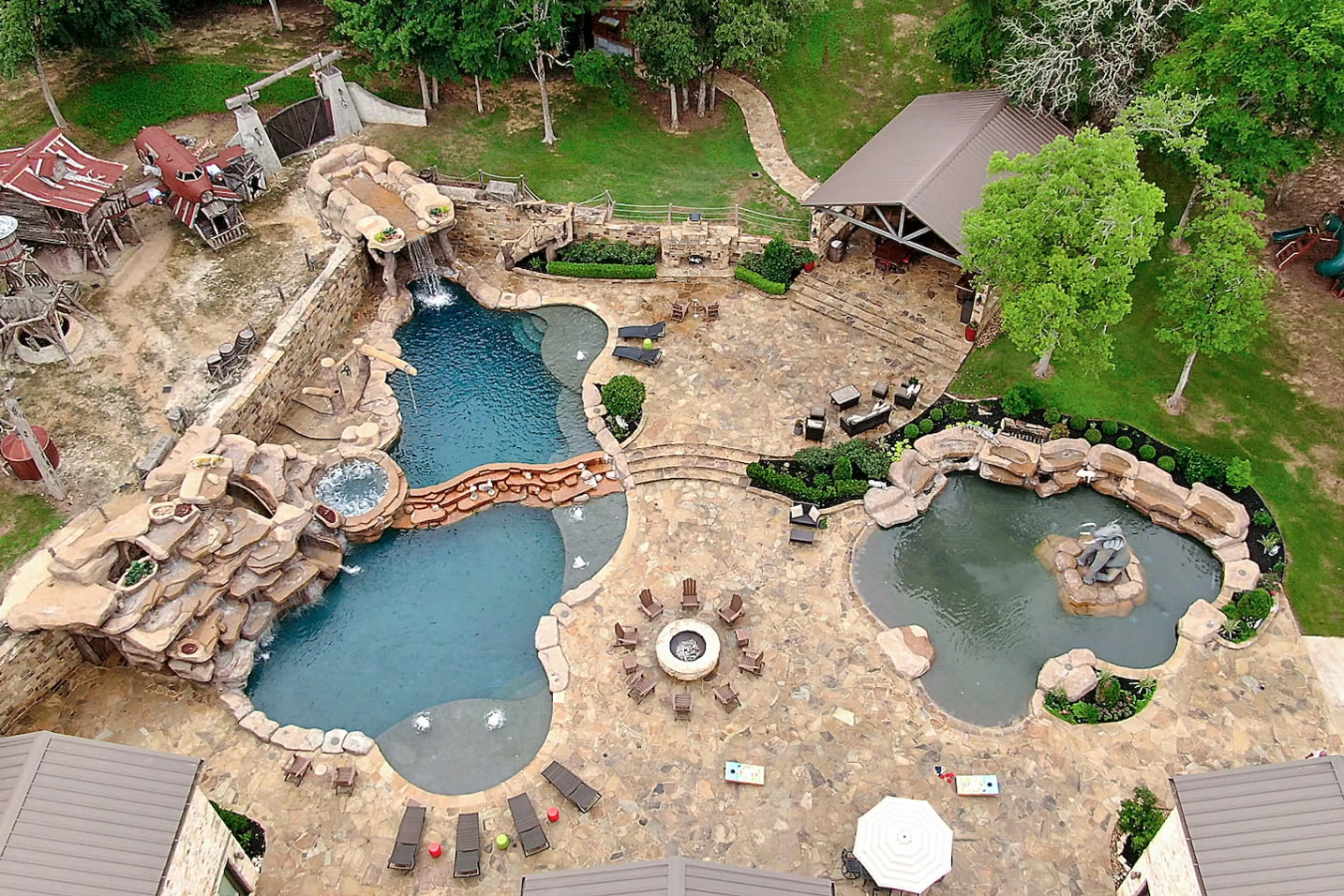 Where adventure meets luxury, we are located 30 mi. from College Station. This unique property sleeps 20 guests with 8 bedrooms, 6 full bathrooms, 3 half bathrooms, a private movie theatre, and multiple living rooms. Outside, there are 3 resort-styled pools, a covered pavilion, 2 playscapes, and 2 o...